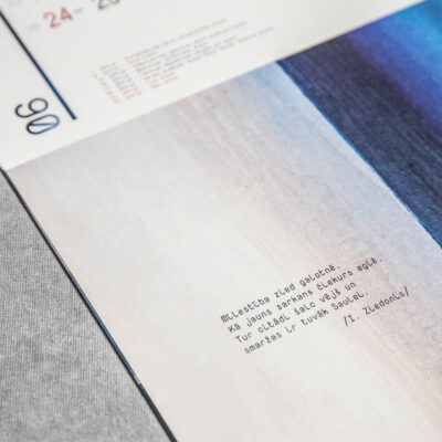 Sienas kalendārs HAIKU ir mūsu dizaineru “gara darbs”. Kalendāra dizaina mērķis ir sniegt harmonisku sajūtu, apvienojot I. Ziedoņa dzeju ar mākslinieciskiem attēliem, kuri viens otru papildina. Kalendārs ir īpaši izveidots klienta vajadzībām, sākot no tā formas līdz kalendāra blokam.