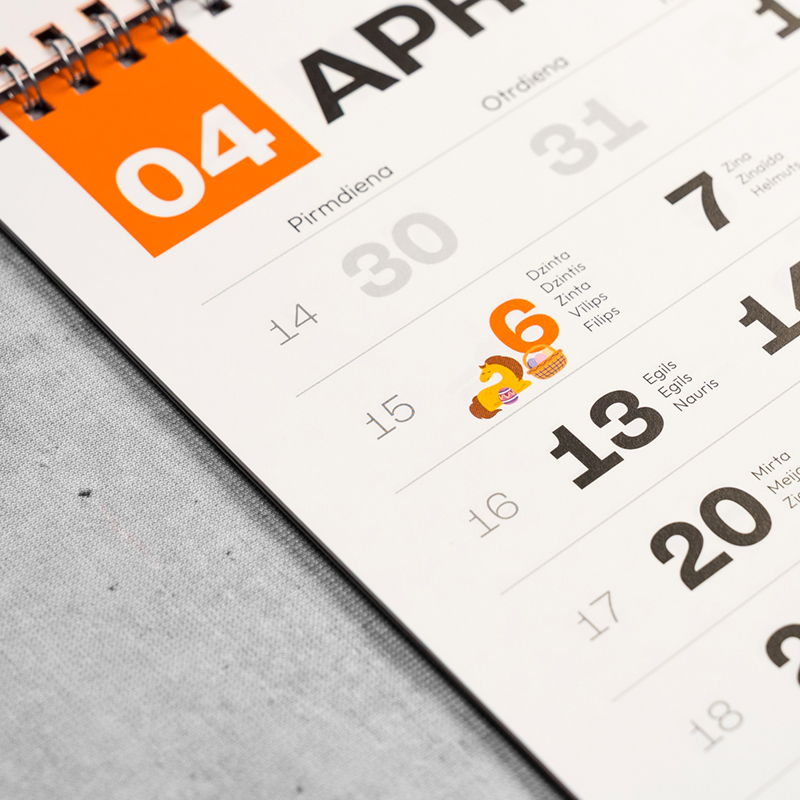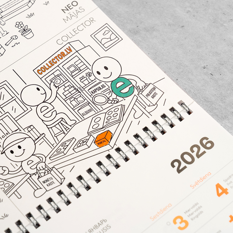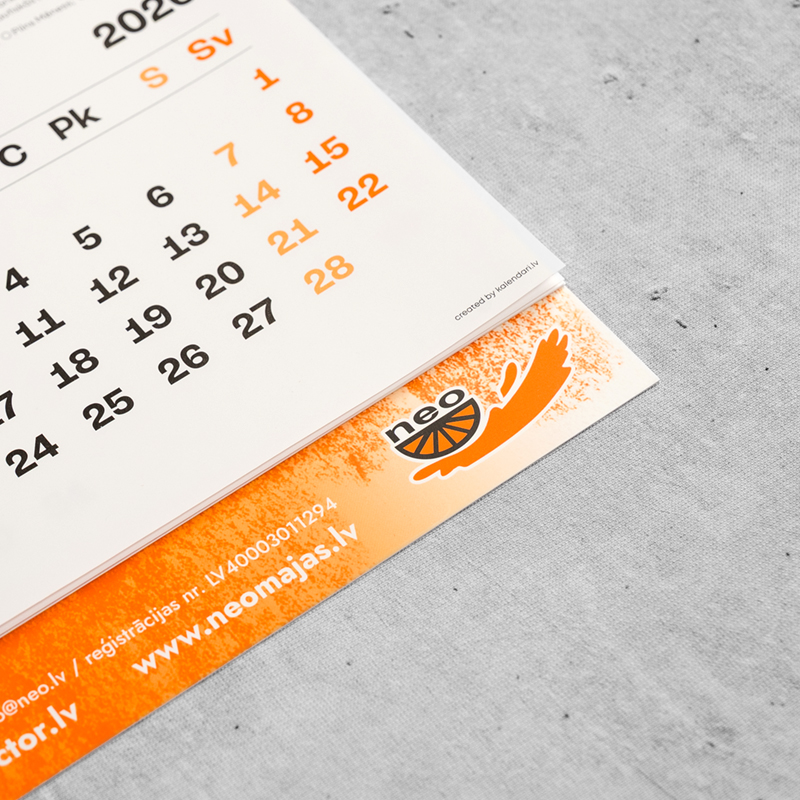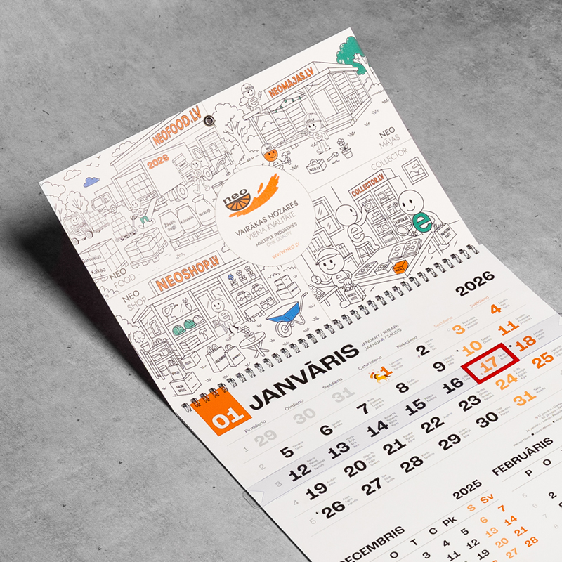Arī šogad NEO izgatavojām pilnībā individuālu sienas kalendāru (ar papildu svētku dienām). Iedvesmojoties no mūsu krāsojamajām grāmatiņām, šogad augšējā pamatne arī ir krāsojama.