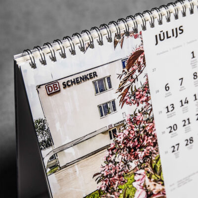 Galda kalendāra vizuālais noformējums veidots, īpaši apstrādājot klienta iesūtītās fotogrāfijas un panākot, ka tās izskatās tā, it kā būtu zīmētas ar flomāsteriem. Katrā kalendāra lapā ir unikāls attēls, kas nes vēstījumu par uzņēmumu. Šis ir greznāks modelis nekā TWIN COMPACT PREMIUM, jo tam izveidojām arī papildus vāku, kas nav iekļauts standarta piedāvājumā.