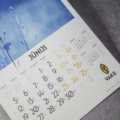 VAKS, kas ir 100% Latvijas kapitāls, ceļas un krīt par Latvijas laukiem, to attīstību un nākotni, apvienojot Latvijas graudaudzētājus. Arī sienas kalendāros B3 PREMIUM šī tēma tiek veiksmīgi apspēlēta. Šogad dizains tika apspēlēts, izceļot elementus uz krāsainā fona ar pelēku krāsu un daļēju UV izlakošanu.
