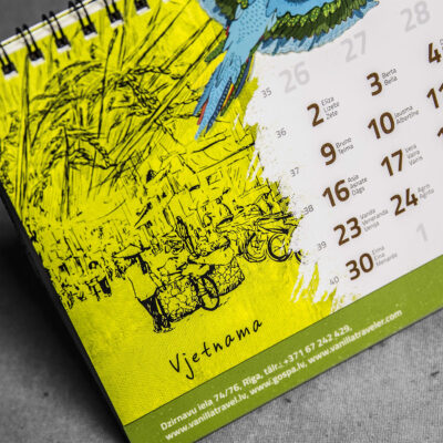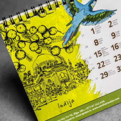 Ievērojot uzņēmuma stilistiku, ar grafiskiem zīmējumiem attēlojām raksturīgākās iezīmes dotajiem ceļojumu galamērķiem. Šis ir ļoti svaigs un uzmundrinošs galda kalendārs, kas ataino brīvības sajūtu, kuru aģentūra garantē ceļojuma laikā. Katra kalendāra lapai ir savs dizains un tam ir īpaši veidota garenāka pamatne, lai būtu vairāk vietas zīmējumu izvietošanai.