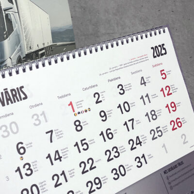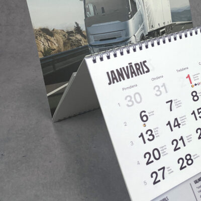 Volvo Truck Latvia izstrādājām trīsdaļīgā sienas kalendāra dizainu ar individualizētu mēnešu bloku, pamatojoties uz uzņēmuma brandbook un iekļaujot papildu svētku dienas.