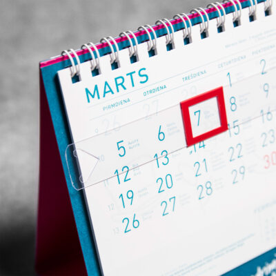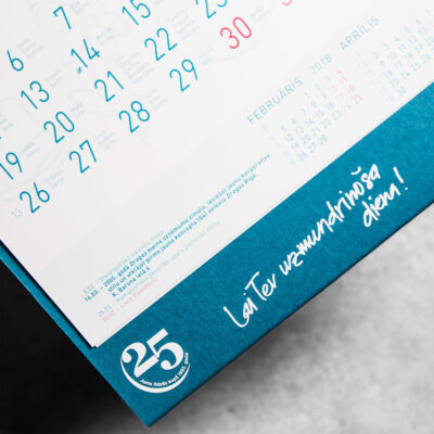 Очень красочный и яркий настольный календарь. Его основу составляют вместе склеенные две дизайнерские бумаги, оттенки которых подобраны в соответствии с визуальным стилем компании и цветовой гаммой. В результате тона и шрифты полностью адаптированы к стилю компании. Основа календаря напечатана трафаретной печатью, с помощью которой на нее также нанесен УФ-лак. АО «Drogas» вышло за рамки основного предложения и выбрало индивидуальный дизайн страниц календаря. Календарь был предназначен для использования внутри офиса.